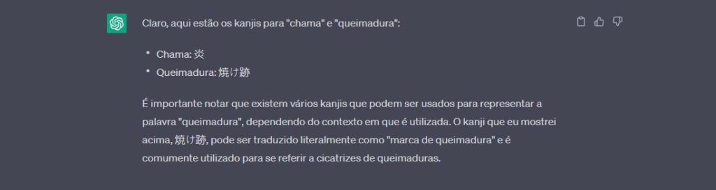 Perguntei ao ChatGPT quais eram os kanjis referentes a “chama” e “queimadura”. Note como ele me informou um kanji especifico sobre cicatrizes, mesmo eu não tendo mencionado esta questão. Porém, se trata de um kanji grande demais. Mas quando vamos para “chama”, podemos ver que se trata de um kanji bem simples. E se a dita cicatriz na verdade não seja feita por fogo ou sequer possua “formato de fogo”, mas sim lembre o kanji de chamas? Isso explica o porquê dele ser tão lembrado por isso. Além disso, um elemento tão genérico como uma cicatriz ganha um significado único a partir desta premissa.