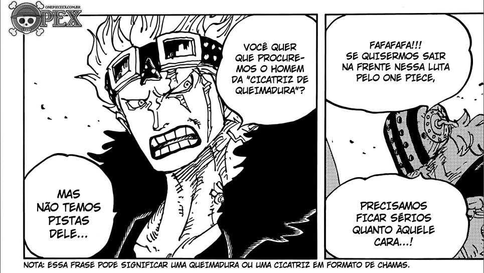 Esta ideia, todavia, não casa com a definição dada para a fala de Kid que eu trouxe na imagem. Também, no capítulo 1081, Aokiji interpreta como sendo uma cicatriz causada por queimadura, indicando que se trata disso mesmo. Há poucos elementos para acreditarmos nessa minha teoria do kanji, mas eu gosto dela, pois corrigiria este “defeito” de um personagem tão importante ser lembrado por algo tão genérico.