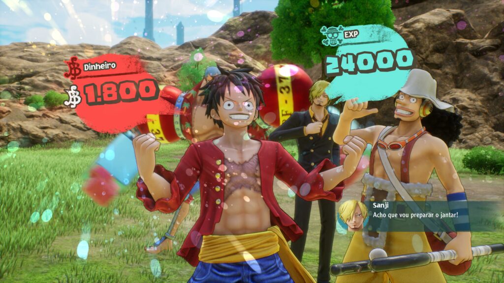 Com muito pesar que falo que One Piece Odyssey não é muito divertido, muito pelo que foi dito acima, a falta de dinâmica do jogo, faz com que jogar ele por muito tempo seja um pouco chato, mesmo com algumas missões secundárias, não tem nada de muito diferente, senti falta de algum tipo de mini-game dentro do próprio jogo, existe uma missão em especifício onde para alcançar o objetivo o Sanji (cozinheiro do bando) precisa cozinhar um prato para agradar um chef de cozinha em troca de alimentos para uma viagem, fiquei todo empolgado achando que teria a oportunidade de “cozinhar junto” com o Sanji, porém, você apenas faz o prato pelo menu mesmo. Então acredito que o jogo focou mais em outras coisas que realmente são muito boas (que já vou falar delas), mas eu gosto de jogar pra me divertir e Odyssey ficou devendo nesse quesito.