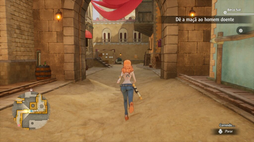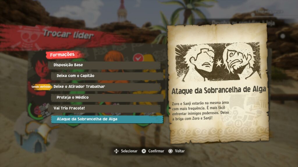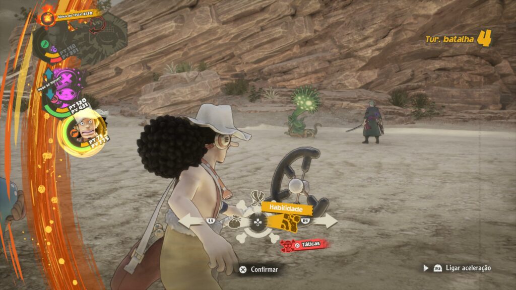 Mas Raul, como assim trabalho em equipe?! Quem assiste One Piece sabe, que uma das coisas mais difícies de se ver ultimamente é o bando reunido, e isso o jogo nos proporciona, nos permite a usar a maioria dos personagens, e cada um tem uma habilidade específica que ajuda a avançar durante o jogo, então se você tem um personagem favorito, da pra usar, você pode caminhar com todos, e o jogo reproduziu o andar de cada um, fica bem legal de ver. A única coisa que eu sugeriria a Bandai Namco é que quando usassemos o Zoro que não tivesse mapa, assim ficaria mais real haha’.