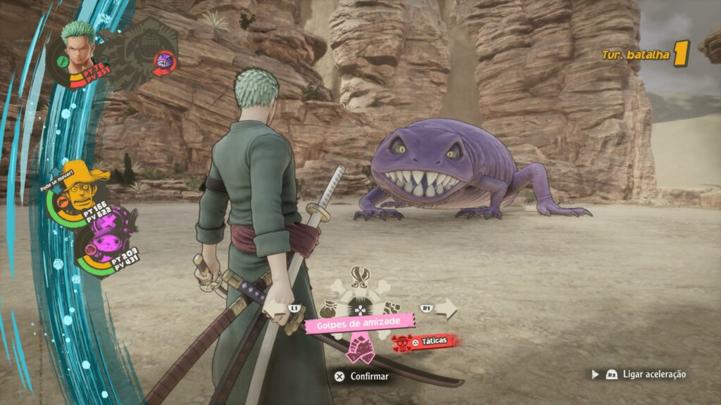 One Piece Odyssey apostou no estilo de batalhas de turno, assim como podemos ver nos jogos do Final Fantasy, e outros RPG’s. Sei que é um método convencional, porém, com batalhas constantes durante a história, certas batalhas são apenas cansativas. Como nesse modo de batalha a estratégia é um diferencial, ao poder usar todo o bando você pode montar estratégias distintas para se dar bem, porém, a dificuldade do jogo é muito baixa, então basta insistir que você consegue ganhar, até mesmo inimigos mais fortes não faz com que você tenha que pensar muito para alcançar a vitória. A estratégia fica por conta dos objetivos que eles colocam para ganhar um bônus de experiência ao fim da batalha, então quem quer evoluir mais rápido, fique atento as objetivos traçados para algumas batalhas. Diria que a única coisa boa que tem no modo de luta é que você pode selecionar os integrantes que vão entrar na batalha, assim você pode se preparar melhor, para não ser pego com o Chopper e Usopp no mesmo time, porém você pode escolher entrar sempre com eles, e também o jogo disponibiliza combos em conjunto, o que são chamados golpes de amizade, o que é a cara dos Mugiwaras.
